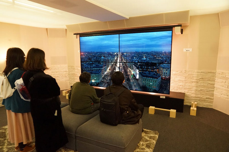 会場入ってすぐに目に飛び込んでくるのが、「8Kリビングシアター」。近未来の“8Kのある暮らし”をテーマにシート型の110インチ8K有機ELディスプレイと22.2ch音響によるサウンドを体験できるようになっている。