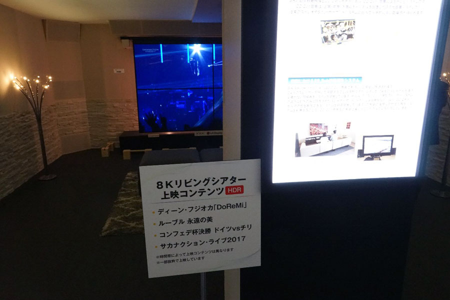 上映コンテンツはNHK制作の8Kコンテンツで、ディーン・フジオカのミュージックビデオ『DoRemi』、『ルーブ 永遠の美』、サッカー『コンフィデ杯決勝 ドイツvsチリ』、『サカナクション・ライブ2017』(いずれも本来の番組からの抜粋)だ。