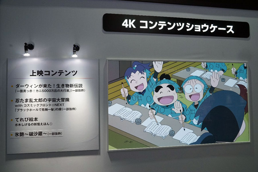 このほかにも、8Kインタラクティブ(双方向)展示や、タテ型の8Kデジタルサイネージによるディスプレイ展示が行われていたほか、「4K/HDRコンテンツ ショウケース」と題した展示コーナーでは、『ダーウィンが来た』や『忍たま乱太郎』といったNHKで放送中の番組の4K/HDRバージョンの上映も実施されていた。8Kつながりで13.3型の有機ELパネルも公開されるなど、まさに技研公開のミニバージョンといった感じだ。