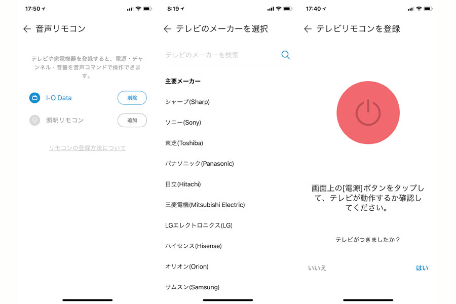 音声リモコン機能に対応デバイスを登録するには、専用アプリ「LINE Clova」を使用する。登録作業はテレビや照明機器のメーカーを選択し、動作確認をしていくだけと非常にシンプルだ。テレビは大手からマイナーまで、たくさんののメーカーが用意されているが、照明機器のメーカーはまだまだ少ないようだ