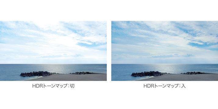 通常はディスプレイ側で行うトーンマップ処理をプレーヤー側で高精度に実施する「HDRトーンマップ機能」。出力先のディスプレイに左右されず、より安定したHDR映像を楽しめるのが特徴だ。なお、初期設定は「切」となっている