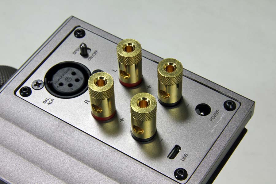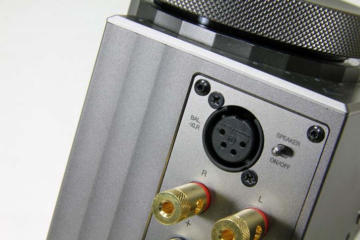 いっぽうで、姿形もさることながら、機能的にもユニークな内容を持ち合わせているのも特筆すべきポイントとなっている。まず、ヘッドホンアンプとしては、ボディ左側面には6.3mm、3.5mm、2.5mmバランスのヘッドホン出力を用意。加えて、背面にXLR 4pinのバランス出力も用意され、さまざまなヘッドホン端子に対応している。それだけでも充実した内容といえるのだが、さらに、背面にはスピーカー用の出力端子も用意されており、ヘッドホンだけでなく、スピーカーでも音楽を楽しむことができるようになっているのだ。これは、画期的なアイディアといえる。