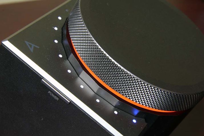 Astell&Kernらしいというべきか、ギリシャのパルテノン神殿をモチーフにしたという「ACRO L1000」の外観は、手前に30度傾いたキューブに大型のボリュームダイヤルを大胆にレイアウト。加えて各所にLEDを配置するなど、既存のオーディオ製品とは一線を画す洒落たデザインにまとめ上げられている。それでいて、サイズは約112(幅)×112(奥行)×160(高さ)mmとなかなかコンパクト。普段からよく目にする、またスペースに限りのあるデスクに置く製品としては、絶妙なデザインとサイズ感だといえる。