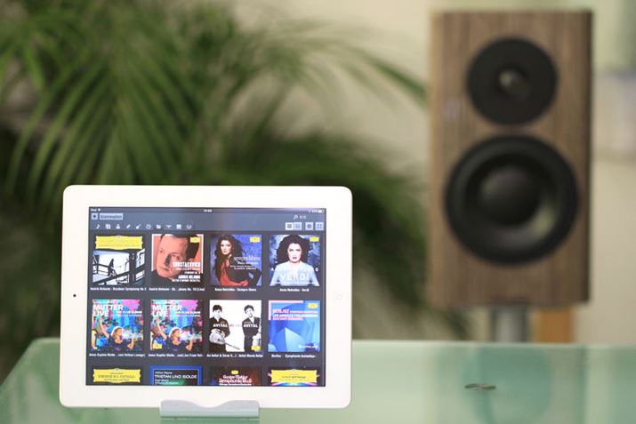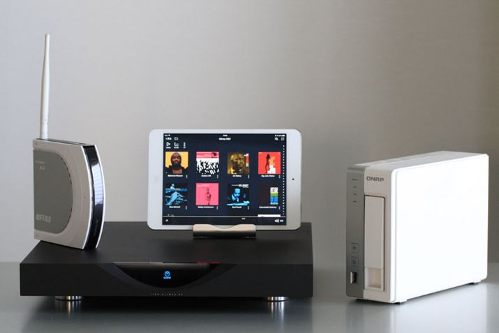 筆者宅のオーディオルームにて。NAS内にある楽曲を、iPadから操作して愛用のシステムで楽しむ。まず、これだけでも操作感はバツグンだ。再生するハイレゾ楽曲はNASの中に入れておくので、昔のようにCDをいちいち入れ替えるようなことは不要。本格的なネットワークオーディオシステムと高スペックなハイレゾ音楽ファイルを組み合わせれば、驚くほどの高音質再生も実現できる