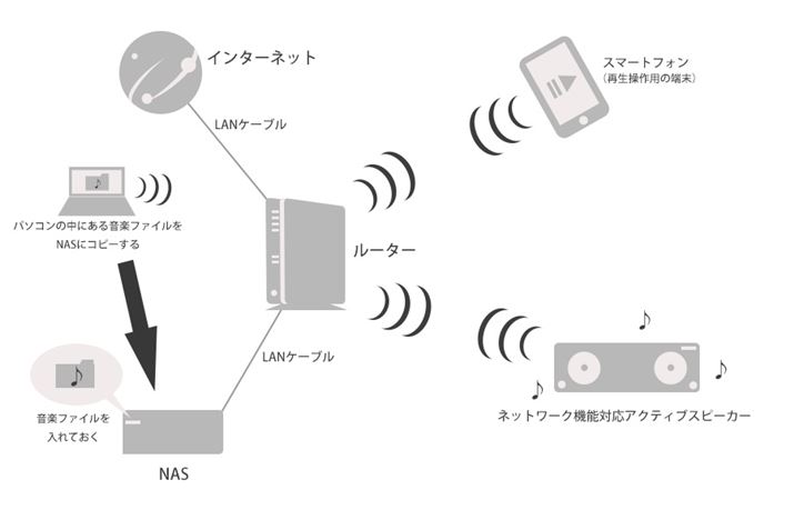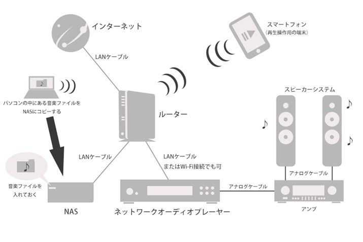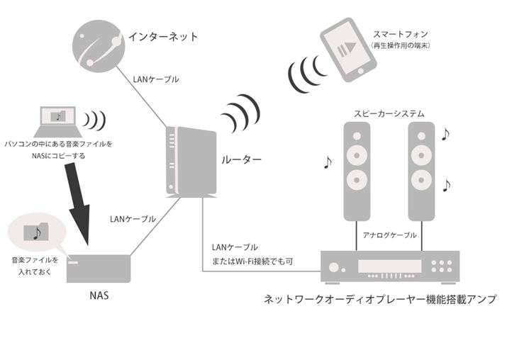セッティングの基本は、以下のイメージ図を参照していただきたい。NAS、オーディオシステム、パソコン、操作アプリをインストールしたスマホ/タブレットを、家庭内LANネットワークにつなげるだけ。あとは、主にパソコンを用いて楽曲配信サイトから音源をダウンロードしたり、CDをリッピングしてデジタル楽曲ファイルを作成しよう。それらをPCからNASにコピーすれば準備は完了だ。