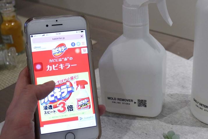 愛用している掃除用洗剤などを入れたボトルに、販売ページのURLを紐付けたQRコード付きのシェアラベルを貼っておけば、洗剤が切れたタイミングでシェアラベルのたQRコードをスマホで撮影することで、製品をすぐ購入できる