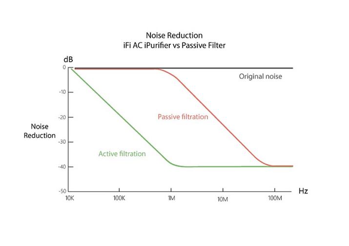 こちら、端的にいえば電源ノイズフィルターだが、一般的なフェライトコアなどとはかなり趣が異なっているのが特徴だ。この「iPurifier AC」には、ノイズキャンセリングヘッドホンなどと同じ原理の「アクティブ・ノイズ・キャンセレーション(ANC)」が搭載されており、検知したノイズの逆相信号を発生させることでノイズのキャンセルを行っている。これによって、周波数帯域全域にわたって-40dBのノイズ低減を実現。フェライトコアなど100MHz以上をメインにノイズ低減が行われるパッシブ型に対して、高い効果を発揮しているという。また、「ワイヤレス・ピュリフィケーション・システム(WPS)」という回路も採用されており、こちらによってダイナミックレンジの低下など聴感上の副作用なしに、ノイズを大きく低減できることもアピールされている。