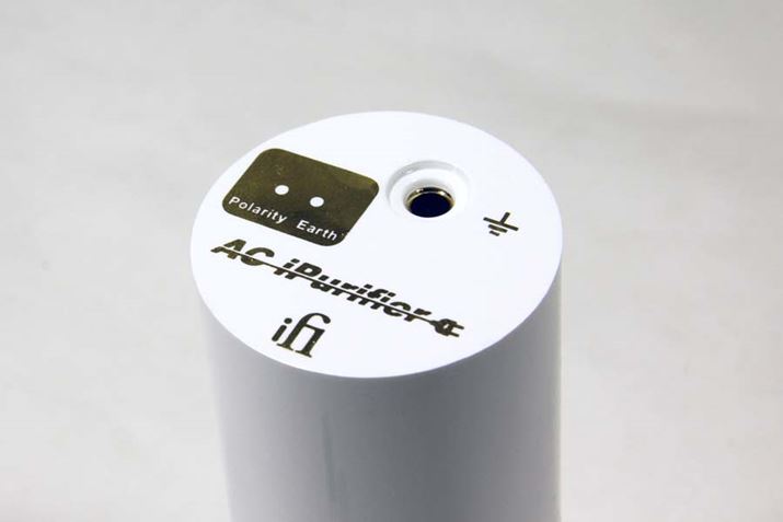 「iPurifier AC」の外観は、まるで大型コンデンサーのような、細長い円筒形をしている。表側には「グラウンド/アースの検出」「極性接続診断」用のLEDランプ2つと「インテリジェント・グラウンド接続」用の端子(4mm口径のバナナプラグが刺さるようになっている)が、反対側には3Pタイプの電源プラグが備わる。とてもシンプルな造りだ。
