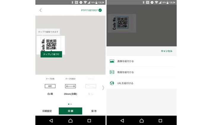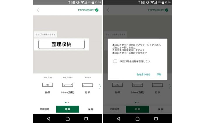 編集が完了したら「印刷」をタップ。設定したデザインとセットされているテープが異なる場合にはアラートで通知してくれるので、テープをムダにしなくて済む