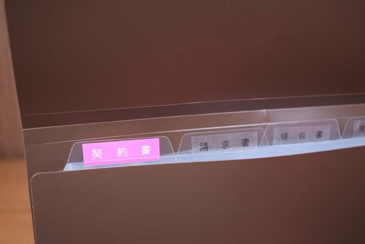 インデックス付きのポケットファイルにペタリ。タブにラベルを貼ってしまう場所を決めておけば、日々増えていく書類もスムーズに整理できるようになる。