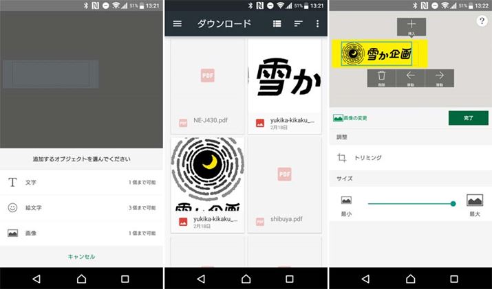 会社のロゴデータを使って、オリジナルラベルを作ってみることにした。追加したいオブジェクトが選べるので、ここではスマートフォンに保存してあるロゴデータを選択。あとは必要に応じて文字や絵文字、フレームを添えれば完成だ。