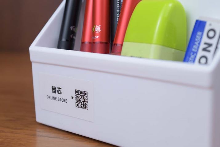 文房具入れにもシェアラベル。消耗品であるボールペンの替え芯、セロハンテープ、消しゴムなどの販売サイトにリンクを貼っておけば、スマートフォンをサッとかざすだけで迷わず追加注文することができる