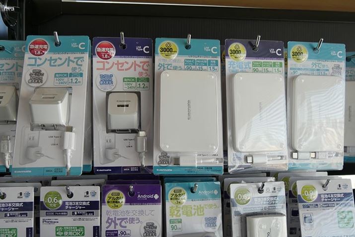 多摩電子工業のスマートフォン向けの充電機器(一部)。既存ブランドには、「tama’s」(2017年まであった「tama」と統一)や「AXiNG」などがある。大手コンビニエンスストアのセブン‐イレブンやファミリーマートなどでも販売されている