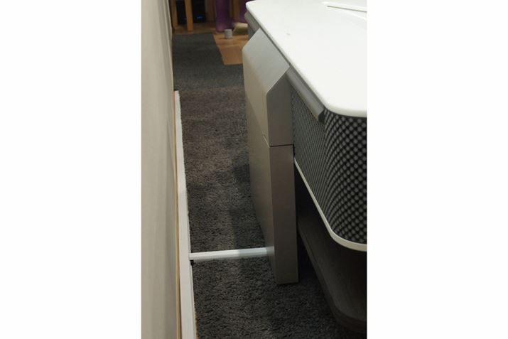 本体下部に設置されているサブウーハー。本体デザインを損なわないように、棚板の真下にすっぽりと収まっている