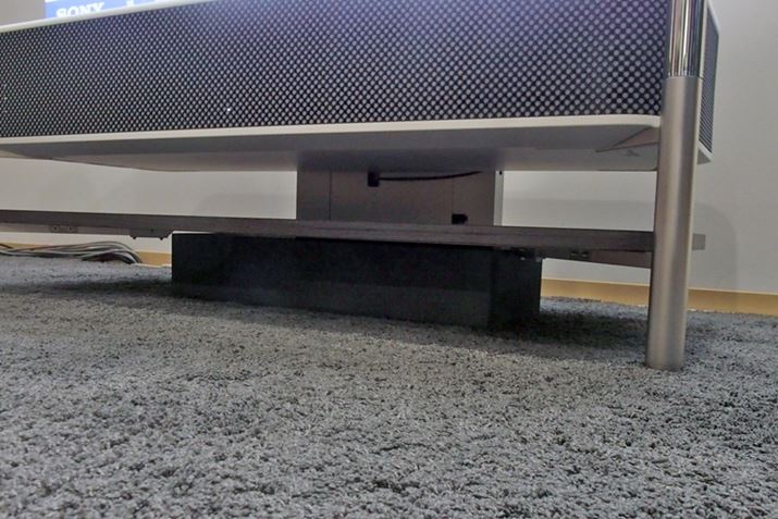 サブウーハーは、見た目のシンプルさを損なわないようにするために、木製の棚板の真下に配置。出力は50Wとやや控えめな印象だが、実際にアクション映画のデモ映像を試聴した限りでは、十分迫力のある重低音再生を楽しめた。