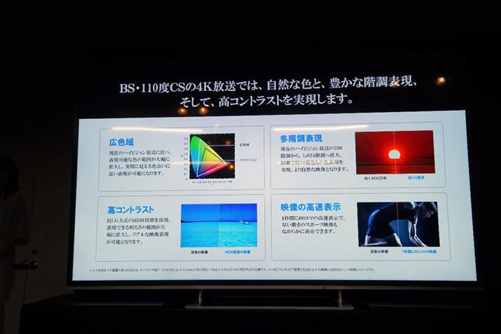 BS・110度CS の4K放送は、BT.2020、10bit階調、HLG方式のHDR、60p表示で高画質な4Kコンテンツを楽しめるのが特徴