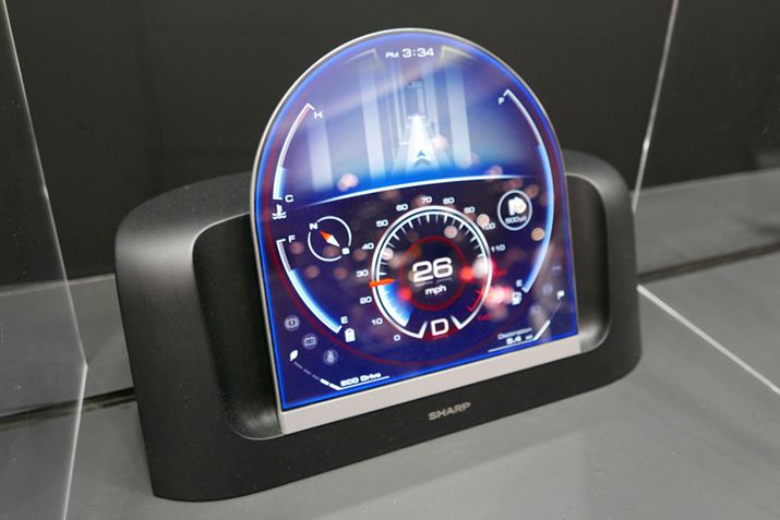 シャープがCEATEC 2015で展示した車載用情報表示を想定したフリーフォームディスプレイのデモ。ディスプレイの形状が自由になれば、製品のデザイン性を高めることもできる