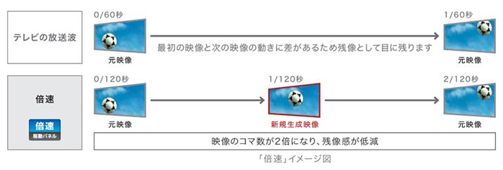 この残像問題を低減するべく、パネルの応答速度の向上に加えて登場したのが、コマ数を2倍にする「倍速駆動」や、4倍にする「4倍速駆動」といった技術だ。コマとコマの間に中間の映像を生成して挿入し、高速に更新することで、残像を短く目立たなくする仕組みである。ただし、元の映像にはない中間コマをテレビに搭載される映像エンジンが生成するので、高度な技術が必要であり、まさにここが製品ごとの“画質差”となって現れる。液晶テレビ選びで特に注目すべきポイントだ。