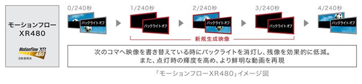 また、上の項で紹介した残像を低減する技術「バックライトスキャン」も、LEDの高速点滅といった特性や分割駆動のなせる業。部分消灯により、チラツキを抑えつつ、黒画面を挿入するのと近い残像軽減効果をもたらす。