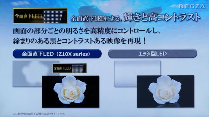 直下型とエッジ型の画質差のイメージ。直下型のハイエンドモデルに対し、スタンダードモデルでは、画面の上下あるいは左右にLED光源を配置する「エッジ型」のモデルが多数(東芝“REGZA”の発表会にて撮影)