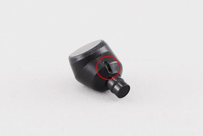 赤丸で囲んだところにマイクが内蔵されているが、フォームチップ装着時はほぼ目立たない。マイクは合計4個(左右のイヤホンそれぞれに2個ずつ)搭載しているという