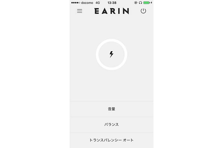 専用アプリのホーム画面。白い円がイヤホン本体のバッテリー残量を表している(カプセルの電池残量は非対応)。そのほかにも、ボリューム調整や左右のバランス調整も行える