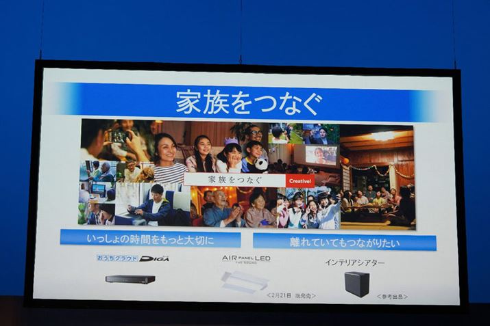 家族を繋ぐ製品として「おうちクラウドDIGA」、「AIR PANEL LED THE SOUND」、「インテリアシアター」の3つが紹介された