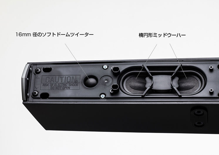 とはいえ、「HEOS HomeCinema」の真骨頂といえば、やはりホームシアター向けスピーカーとしての実力だろう。メインスピーカーは、51mm×127mmケブラー繊維入り振動板採用楕円型スピーカー+16mmソフトドームツイーターによる2ウェイシステムが、本体左右にステレオ配置されている。