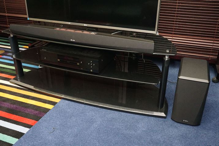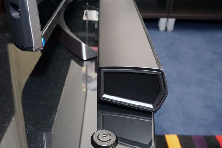 サウンドバー本体。一緒に写っているテレビが40インチクラスの小型モデルのため、サウンドバー本体が大きく見えるが、本体サイズはこのクラスの製品としては一般的な大きさといえる