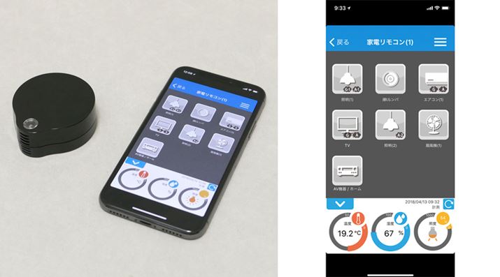 写真左の黒い物体が、ラトックシステム「RS-WFIREX3」。専用アプリ「家電リモコン」(右)から操作を行うと、リモコンの赤外線信号が発信され、家電製品の電源オン/オフなどが行える