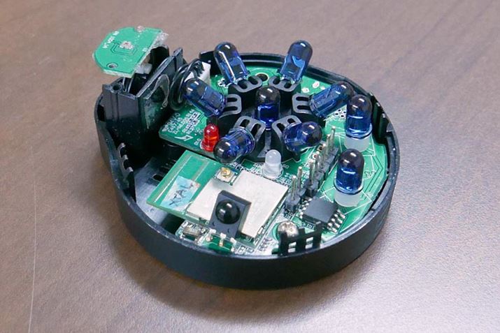 RS-WFIREX3の内部。赤外線リモコン信号発信用LEDが9個配置され、製品を中心に半球方向をくまなくカバー。家電製品に付属のリモコンよりも強力で、確実に操作を伝えてくれる(※注:写真は試作品で、量産品とは一部異なります)