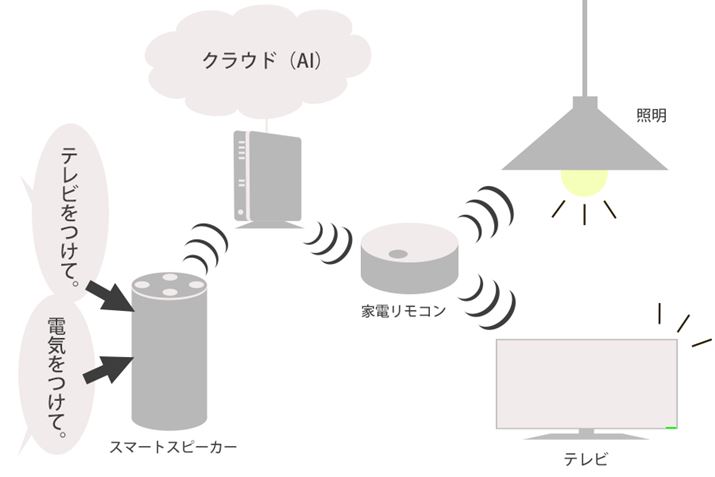 スマートスピーカーとWi-Fi家電リモコンを組み合わせた家電操作のイメージ図。普段我々が家電操作に使っているリモコンの原理をそのままに、操作性を発展させたものと考えれば理解しやすいだろう