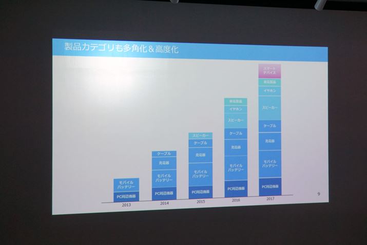 モバイルバッテリー中心の製品展開だった設立当初に比べると、オーディオ製品の占める割合が年々増加しているという