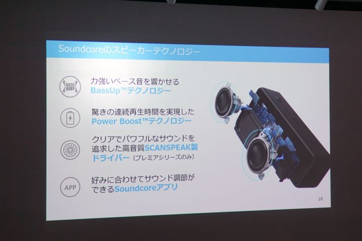 新事業戦略発表会のなかでは、今後投入予定の新製品についても明らかにされた。Bluetoothスピーカーは、手のひらサイズの小型スピーカー「Sondcore Mini」、AnkerのBluetoothスピーカーのDNAを受け継ぐ高コスパモデルという位置付けの「Sondcore Motion」、360°タイプのBluetoothスピーカー「Soundcore Flare」、プレミアムラインの「Sondcore Model」の計4シリーズを展開予定。コンパクトな筐体で力強いベース音を響かせる「BassUPテクノロジー」や、モバイルバッテリーの開発のノウハウを生かし、音声信号に応じた電圧でスピーカーを駆動させることで省電力化を実現する「Power Boostテクノロジー」など、これまでAnkerのBluetoothスピーカーで培ってきた各種テクノロジーを惜しみなく投入したモデルになっているという。