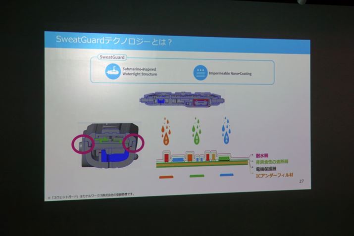 軍事技術を応用した4層のナノコーティングを用いることで、構造設計段階でIPX7の防水性能を担保しているという