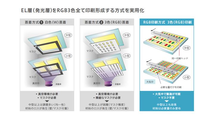 いっぽうの「印刷方式」は、インクジェットプリンターの要領で、有機EL素材を基板に印刷するもの。必要な部分に必要な量だけ印刷するので素材のムダが少なく、真空環境が不要なので、製造装置が比較的シンプルで費用も抑えられるメリットがある。過去、有機EL素材をインク化するのが難しく、実用化や製品化に時間を要した。
