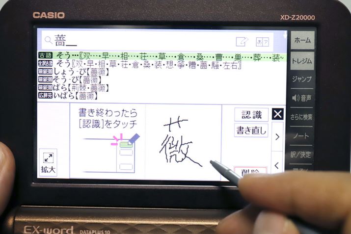 「EX-word」の手書き検索。1文字書くごとに自動で絞り込み検索が行われるので、結果的にかなりスピーディーに結果が得られる