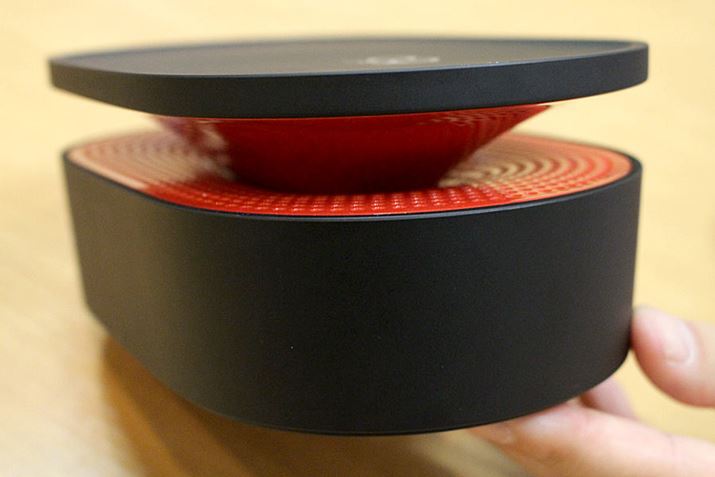 スピーカーは下部のケースの中にあり、上部のオーディオコーンデフレクターにより、音楽が360度に広がる構造になっています