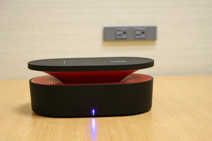 本体の上に置くだけでスピーカーから音が出てくる秘密は、スマホを置く本体上部に内蔵された電磁誘導センサー。スマホなどのデバイスから出る音楽の磁気波を捉え、信号を増幅し本体底部のスピーカーを鳴らします。中身を分解したわけではないので、筆者の予想ですが、スマホが再生する音をマイクで拾って、アンプで増幅、スピーカーを鳴らす仕組みかと思われます。