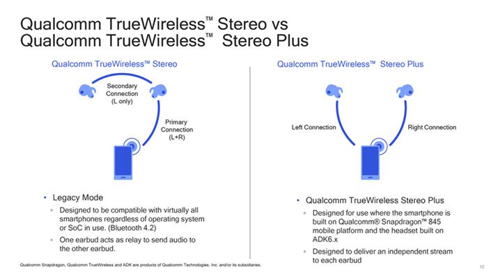 A2. TWS Plusは利用できませんが、完全ワイヤレスイヤホンの使用可能時間が大幅に伸びるというメリットは受けられます。QCC5100はイヤホンのL側とR側にそれぞれ1個搭載されるわけですが、Snapdragon 845非搭載のスマートフォンと接続した場合、スマホとつながる「親」を左右で適度に交代させる仕組みになります。
