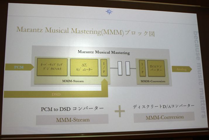 オリジナルのアルゴリズムによってPCM入力データをDSDデータ(11.2MHz/12.3MHz)に変換処理することで、DSDと全く同じD/A変換プロセスで再生できる。なお、DSD入力データは「MMM-Stream」内で信号処理を行わず、「MMM-Conversion」に伝送される