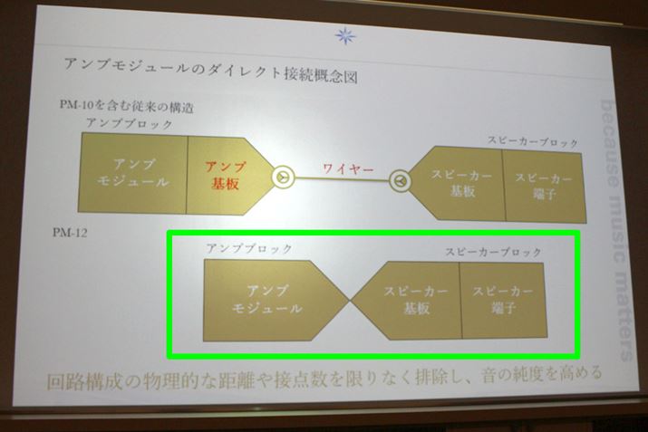同社が“ダイレクト接続”と呼称する方法で、簡単に言うと、パワーアンプモジュールを横向きに倒して挿入し、スピーカー基板に直接接続するというものだ。これにより接点を減らし、パワーアンプからスピーカー出力までの経路が大幅に短縮化され、結果としてダンピングファクターをPM-10比で2倍も高めているという。