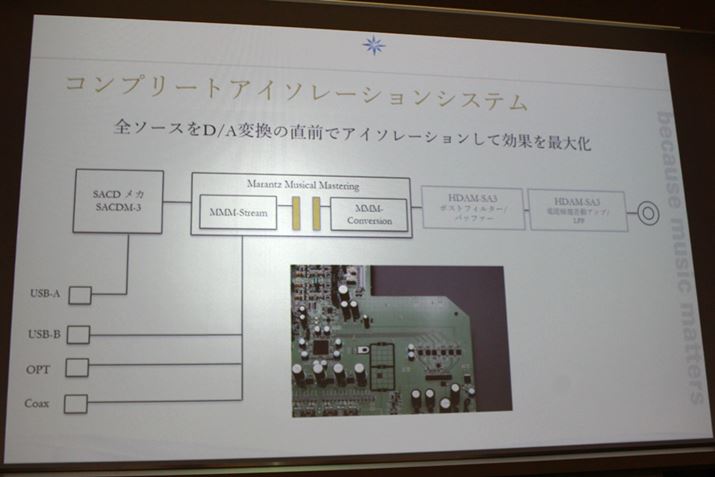 ディスクリート設計ならではのポイントとして、音質に影響するパーツを自由に組み合わせ、回路規模を自由に構成していること、デジタル変換する直前でノイズをアイソレーションする「コンプリートアイソレーションシステム」を搭載していることなどがあげられる。