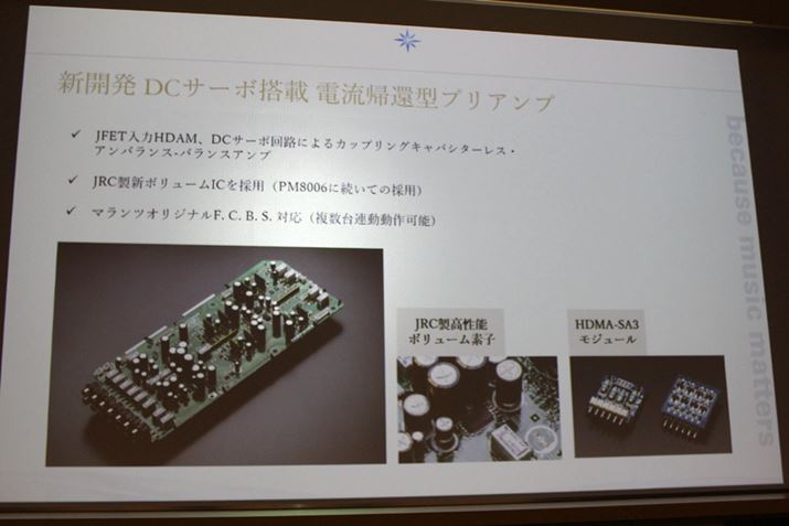 プリ部の回路はPM-12のために新しく開発されたもの。マランツ独自の高速アンプモジュール「HDAM-SA3」を用いた電流帰還型アンプに、JFET入力とDCサーボ回路を組み合わせた1段構成としている。