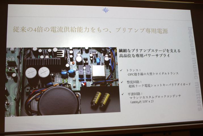 そのほか、MM/MC型の両方に対応するフォノ回路も新開発されており、20dBのゲインを持つMCヘッドアンプと、40dBのゲインを持つ無帰還型フォノイコライザーアンプの2段構成を採用。1段あたりのゲインを抑え、低歪を図っている。