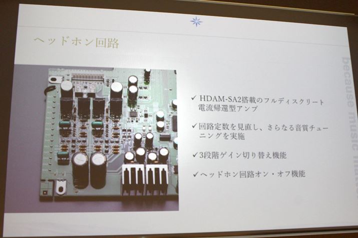 ヘッドホン回路は、HDAM-SA2都債のフルディスクリート電流帰還型アンプ。回路定数を見直し、音質チューニングを行っている。3段階のゲイン切り替えが可能で、ヘッドホン回路自体のオン/オフ操作もできる