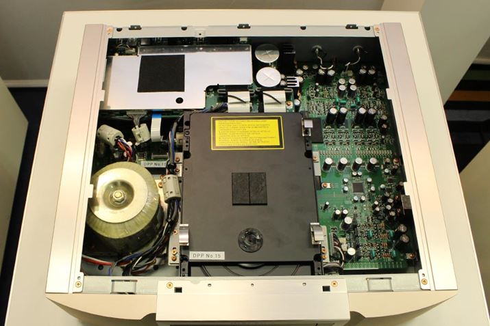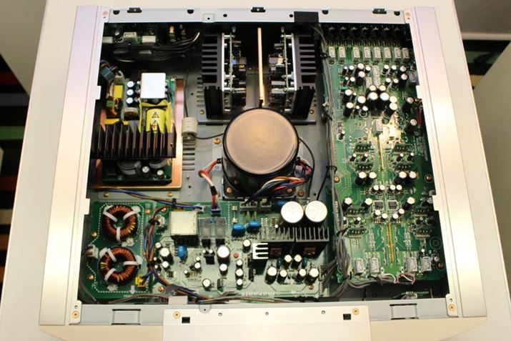 トップカバーを開けたところ。内部には、トロイダルトランスやカスタム・ブロックコンデンサー、精密メルフ抵抗、高音質電解コンデンサーなど、高音質パーツをふんだんに採用