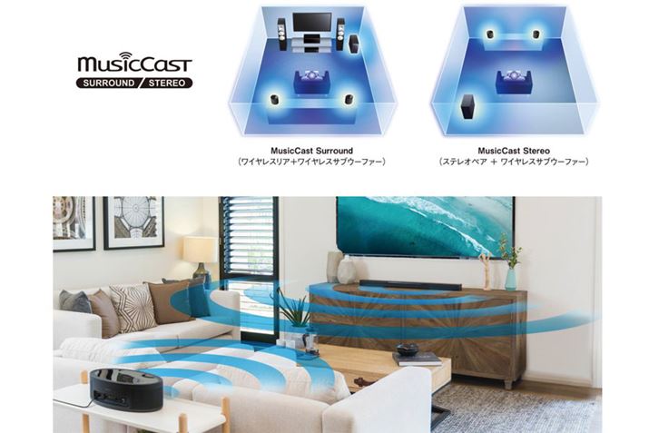 本機もMusicCast対応機器なので、たとえばMusicCast 50/MusicCast 20をリアスピーカーに、MusicCast SUB100をサブウーハーにしてそれぞれとワイヤレスで接続することができる(MusicCast Surround※フロントピーカーは有線接続となる)。リビングで、手軽にサラウンド環境を構築できるアイテムとして注目したい。