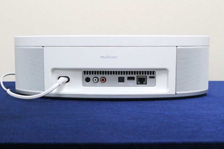本体背面に音声入力端子として光デジタル/RCA/ステレオミニを装備しており、有線経由でも音楽デバイスと接続することができる