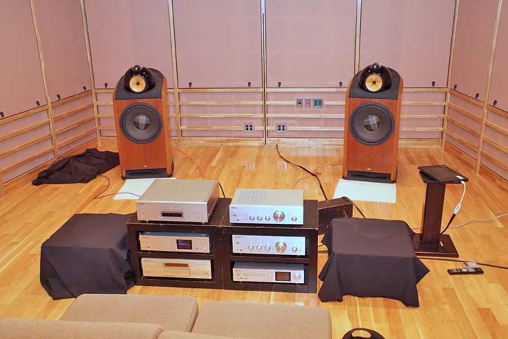 今回の試聴環境がこちら。SACDプレーヤーやネットワークオーディオ機器から「A-40AE」に入力し、B&W「801-Nautilus」で再生を行った